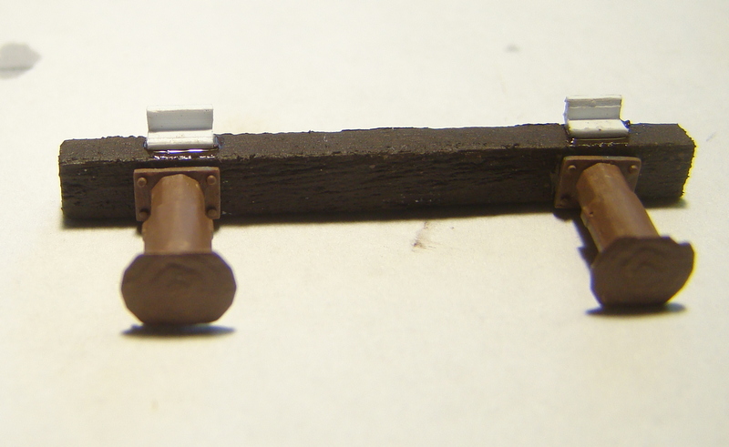 Tady je složený pražec který je vyrobený z smrkového hranolku 3x3mm sesmirkovaného na 3x2mm. Do něj jsem navrtal díry a usadil nárazníky. Z evergreenu profilu L 1,5x1,5 jsou udělané ocelové úhelníky přes které je pražec v reálu přišroubovaný k betonu. Jak nárazníky tak i úhelníky jsem natřel syntetikou revell kterou mám namíchanou na odstín REZ.