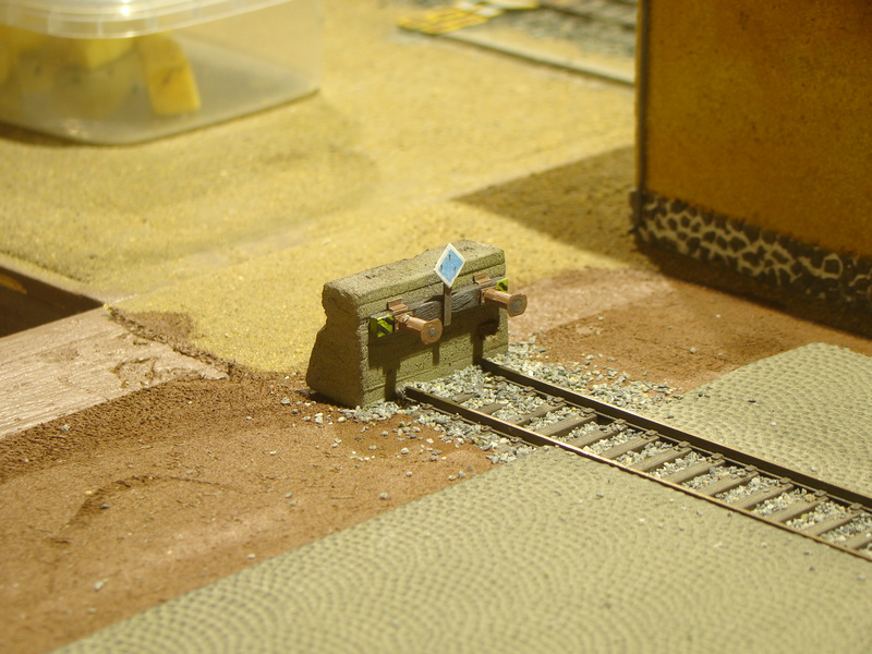 Tady jsem se snažil naznačit mastnotu na styčných plochách nárazníků a nějakou patinu. Na styroduru akryl, na nárazníkách a pražci syntetika.