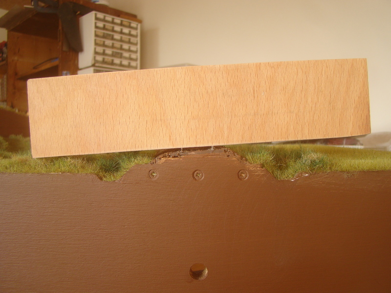 Kvůli tomu převýšení a změně z klesání na rovinku muselo dojít k většímu počtu výstuh abych donutil překližku se ohnout. Trať je v levo v klesání a převýšení a vpravo v rovině. Uprostřed je místo na most který už je v rovině.