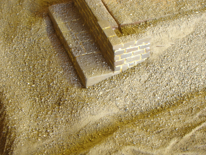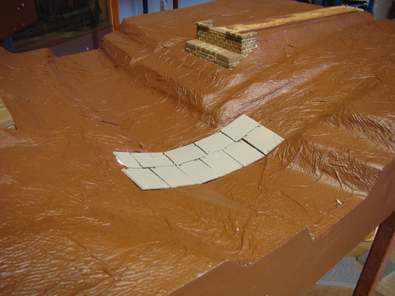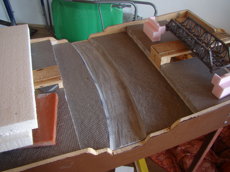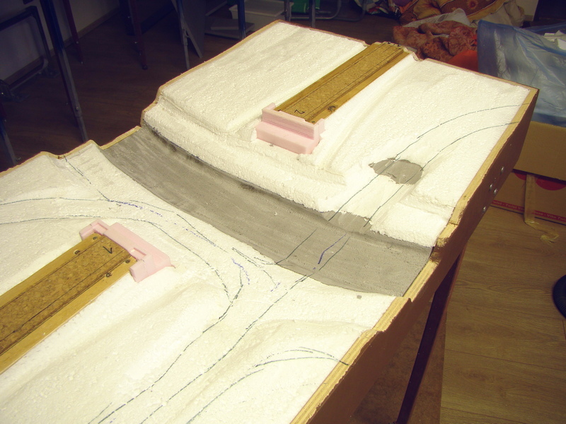 Následovalo vrstvení polystyrenu a jeho úprava do tvaru. Používám na to trafopájku s vytvarovaným velkým očkem. Sice to smrdí, ale jde to dobře. Pak povrch přebrousit hrubším smirkem. Naznačil jsem si i vedení polních cest, kde jsem si ještě namyslel brod přes říčku.....
