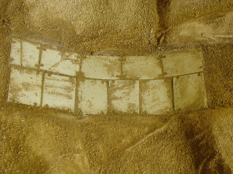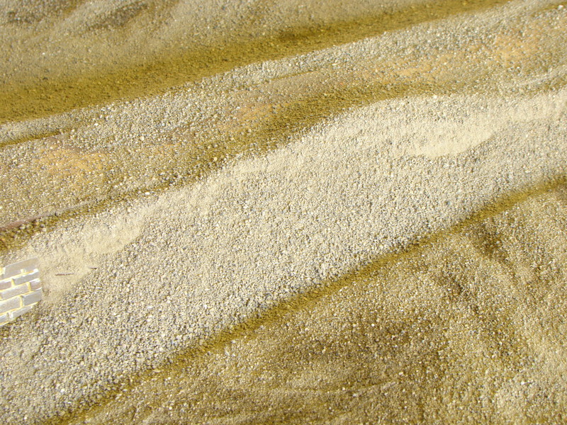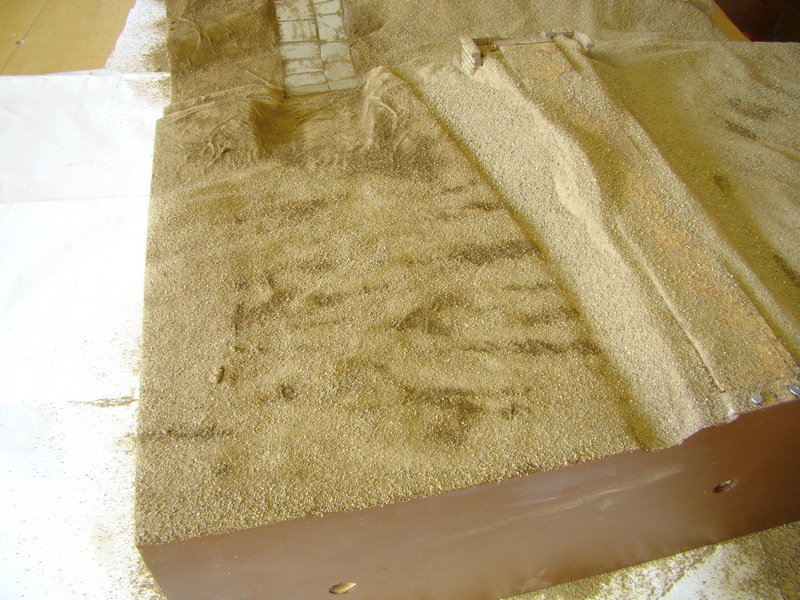 A tady máme tzv. dobu hliněnou. Přesátá hlína kterou sypu na modul natřený hustým duvilaxem. Natřu kus, zasypu. Nesypu až na kraj toho natřeného lepidlem ale nechám kus lepidla bez hlíny a po zasypání části pokračuju tak, abych sypal pořád do lepidla a nenatíral přes hlínu. Hlínou nešetřím. Přebytek vysypu na velký karton a zpět do krabičky. Na brodu jsem hlínu roztíral prstem a nakonec poutíral starým hadrem co už mě tam nepasovalo.