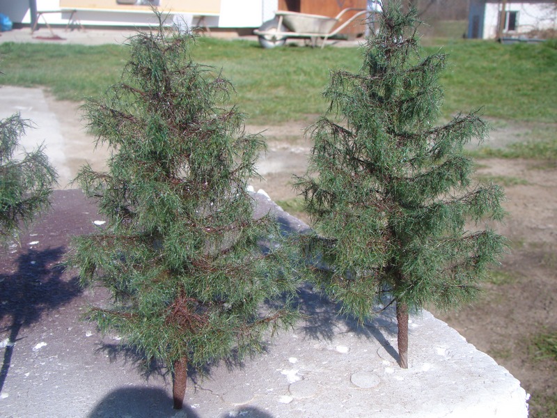 Netřeba flokovat úplně nahusto ať není ze větví chomáč zeleného. Flokuji opět pokud možno se spodu a jen vršek ze stran. Opět se snažím flokování sfouknout dolů fénem. Tak nějak vypadají po naflokování oba druhy stromků. Jak "středolesový" tak i "krajolesový".