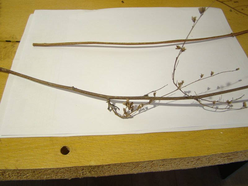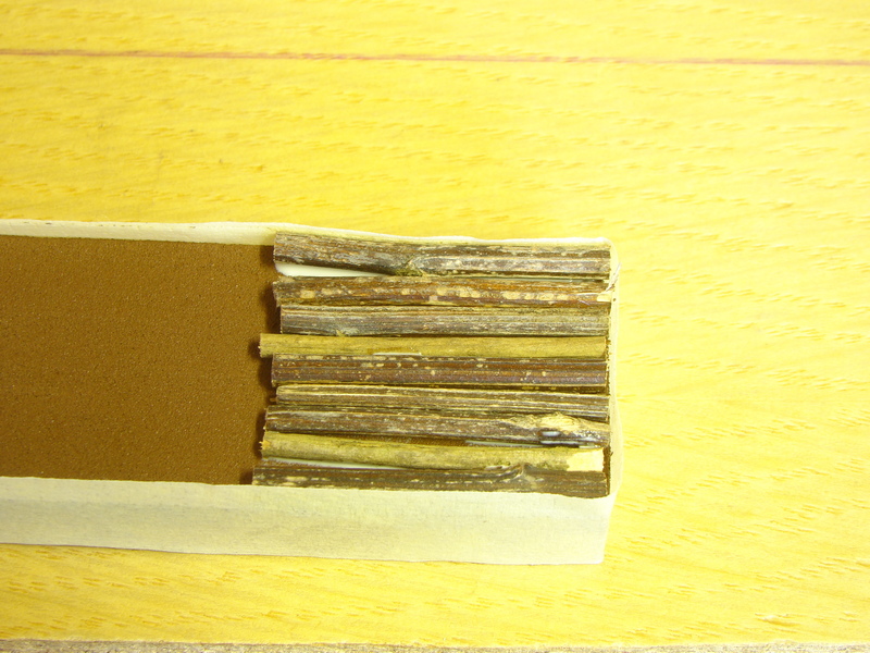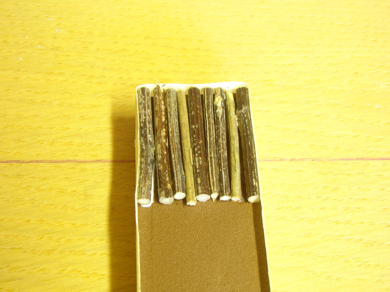 Je potřeba si dopředu nachystat materiál který by kulatinu imitoval. Není úplně jednoduché najít vhodný neboť třeba větvičky stromů pokud jsou tenké, tak mají blízko sebe pupeny a to by nevypadalo dobře. Nakonec jsem našel více méně dva vhodné kandidáty, které jsem si nastříhal a snad rok doma sušil.