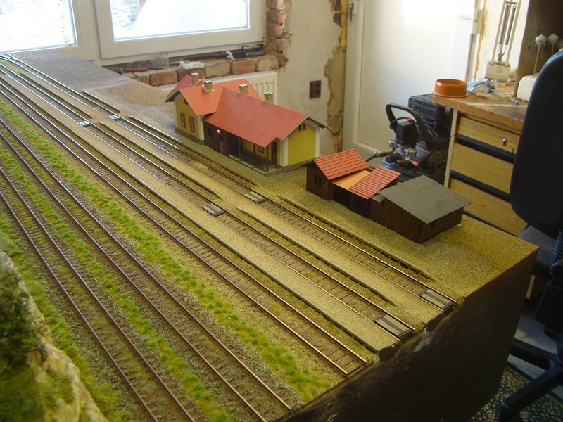 Dále došlo na umístění výpravní budovy a záchodků s šopkama. Obě budovy jsem si obkreslil na modul, prostor pro ně vymaskoval a následně plochy natřel duvilaxem a zasypal hlínou. Následně dosypal nástupiště štěrkem někde něco dosypal a nástupiště prostříkal ředěným sportakrylem. Mezi výpravní budovu a skladiště dolepil dlažbu a opět zasypal hlínou a kterou jsem fixoval ředěným sportakrylem.