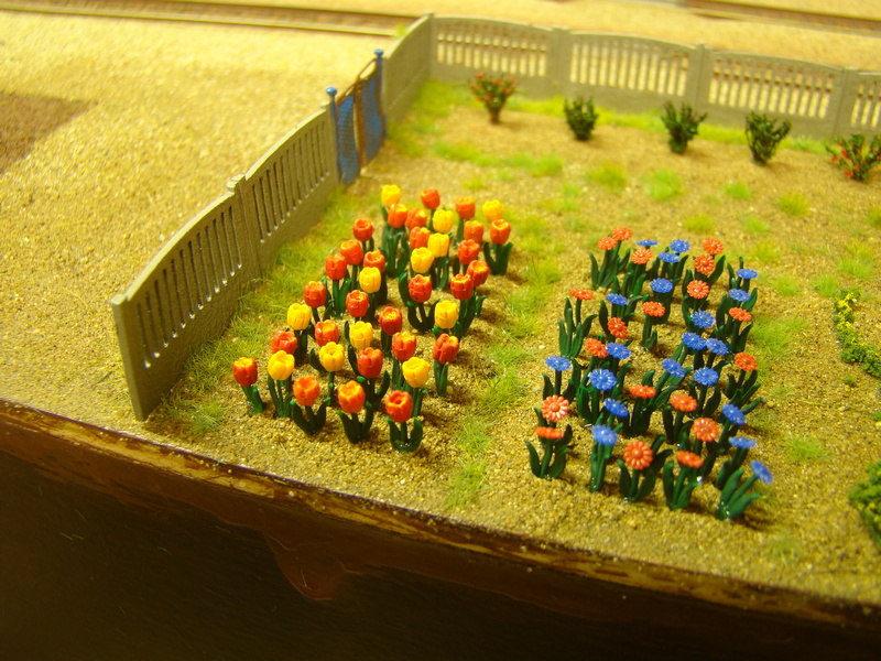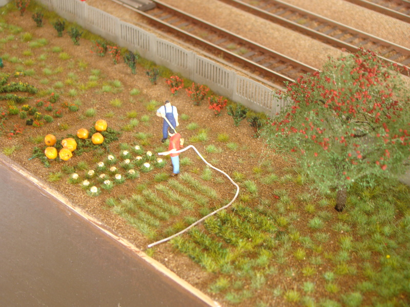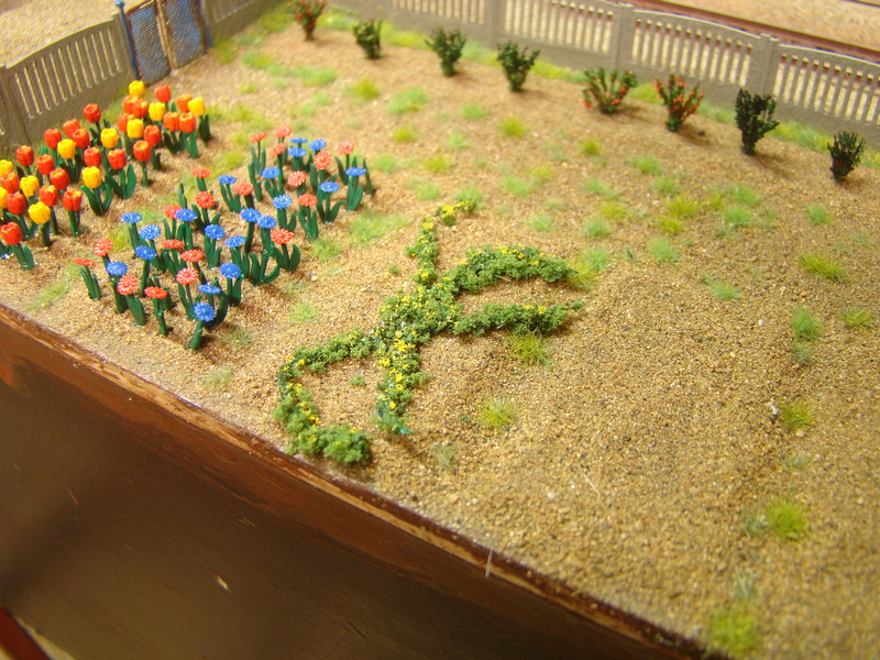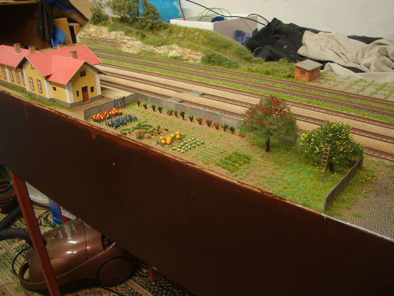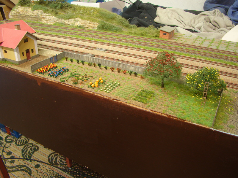 Sice jsem tohle měl asi dělat před zahliněním, ale nevěděl jsem co kde bude a zahrádka mě napadla až to bylo hotové. No asi se nic moc nestalo. Nalepil jsem z papíru vylaserovaný plot, z drátu sletovanou branku a ze styroduru jsem vytvořil základ jednotlivých záhonků.